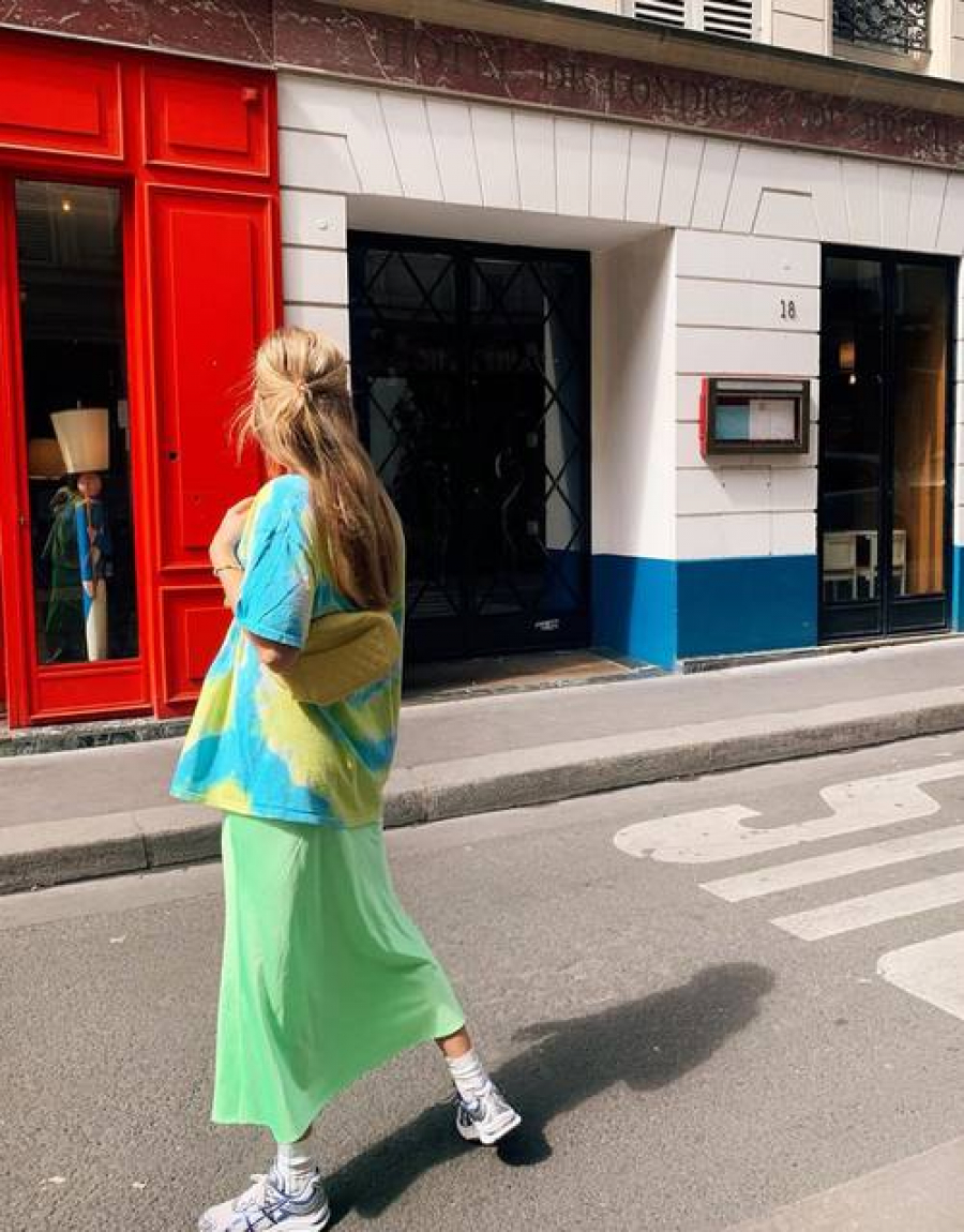 Ο πιο trendy συνδυασμός του καλοκαιριού, φούστα σε neon απόχρωση, sneakers και t-shirts tie -dye